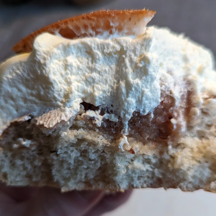 From the team that used to be Bageri Petrus on Södermalm, it's a large, 10cm semla, with a triangular lid. It's wider than tall, which makes it look a little squat. I can just see a bit of almond paste at one spot, peeking out from under the swirl of cream.