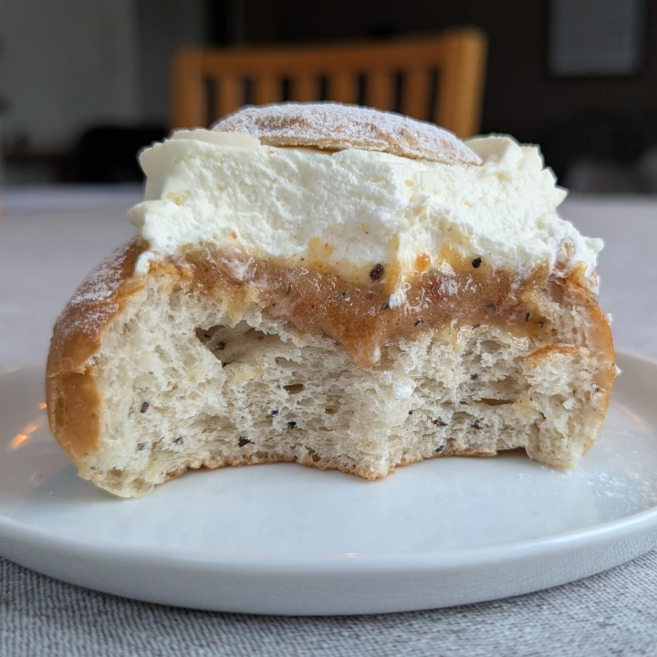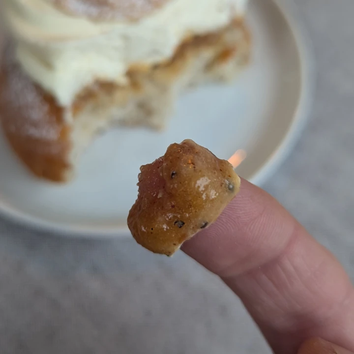 Visually, there's a neatly trimmed round lid that's noticably smaller than what was cut off from the bun. A gentle dusting of icing sugar. Visible, good sized chunks of fresh cardamom, and seemingly plenty of it. The cream though has lost a little of its definition. The almond paste is a caramel colour, a bit of a yellowish-brown hue. It's a noticeably different colour to "normal".