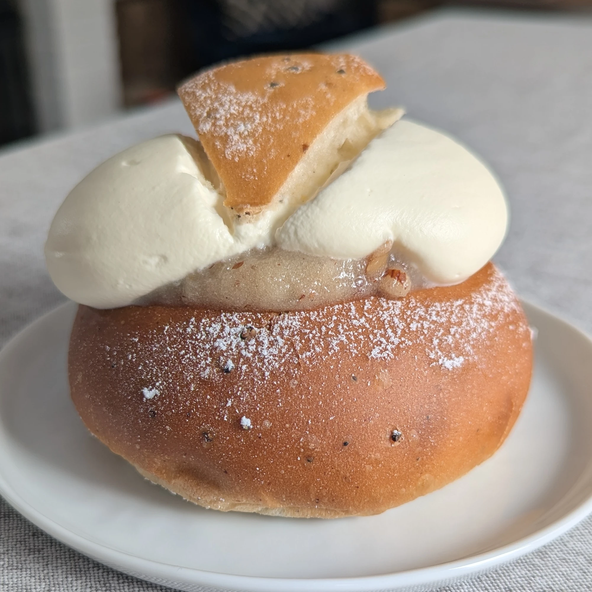 It's instantly quite a visually striking semla. A reasonably modest 7.5cm tall, but a whopping 10cm wide. It's built like a rugby player.