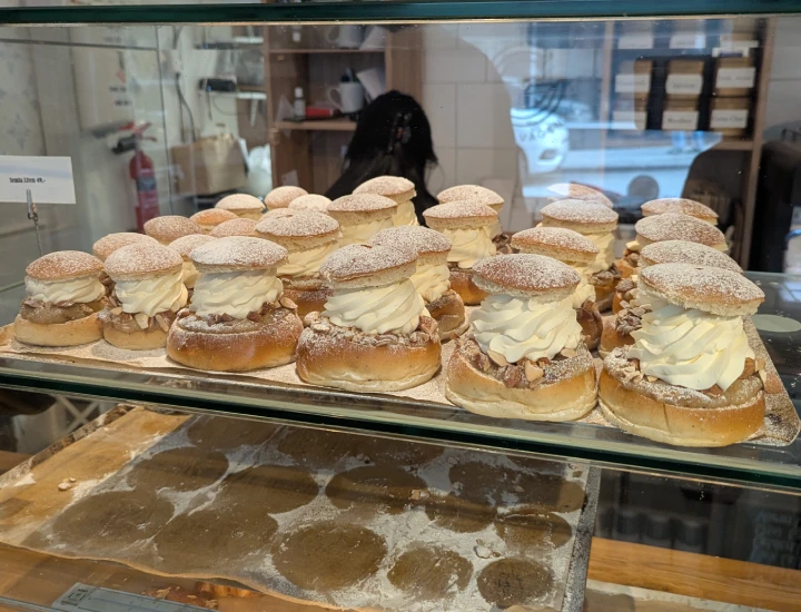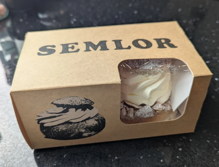 On tasting, it's creamy cream and the almonds reveal themselves as lightly roasted. Genuin made a traditional semla. It's enjoyable but safe. There's slightly too much cream, and slightly too little cardamom. The bun is also slightly drier than it could be.