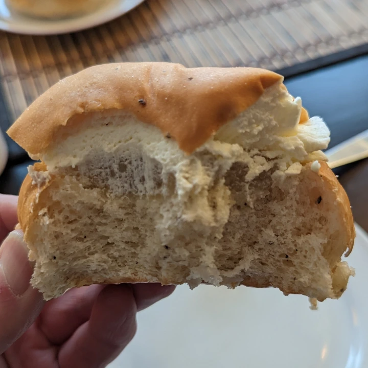 It has a massive untrimmed lid. The bread is dry and comprises quite a substantial part of the whole semla. It tastes more of vanilla than anything else. I can see dots of cardamom but can't taste them. There are traces of finely chopped nuts in the almond paste. But it's mostly sugary and vanillary. The cream seems to have icing sugar in it, so it tastes more sweet than creamy.