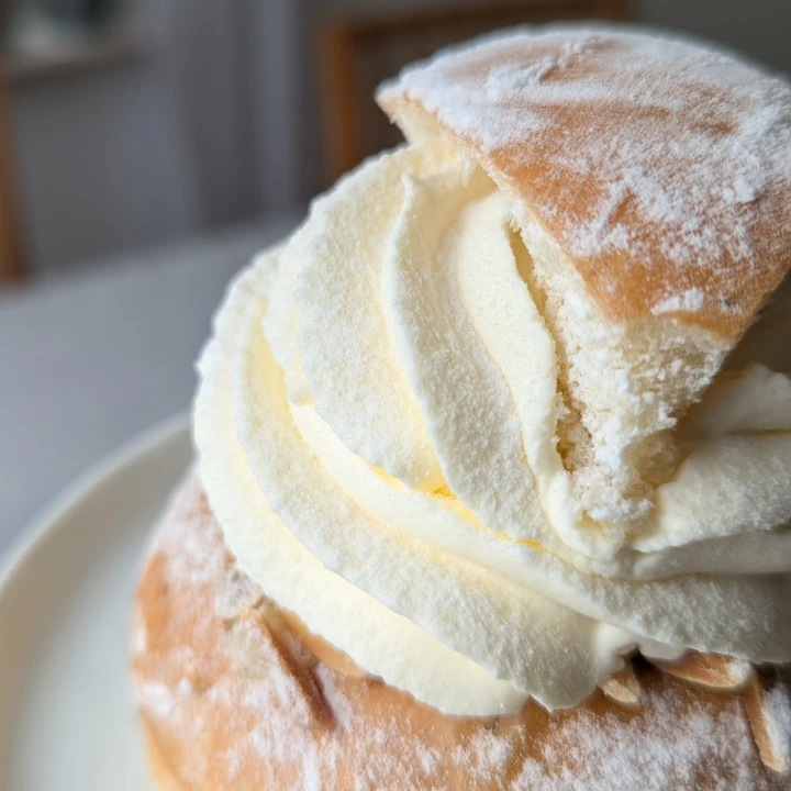 The bun feels soft and gentle to the touch and an even golden brown color. A few slithers of almond are peeking put from under the cream.