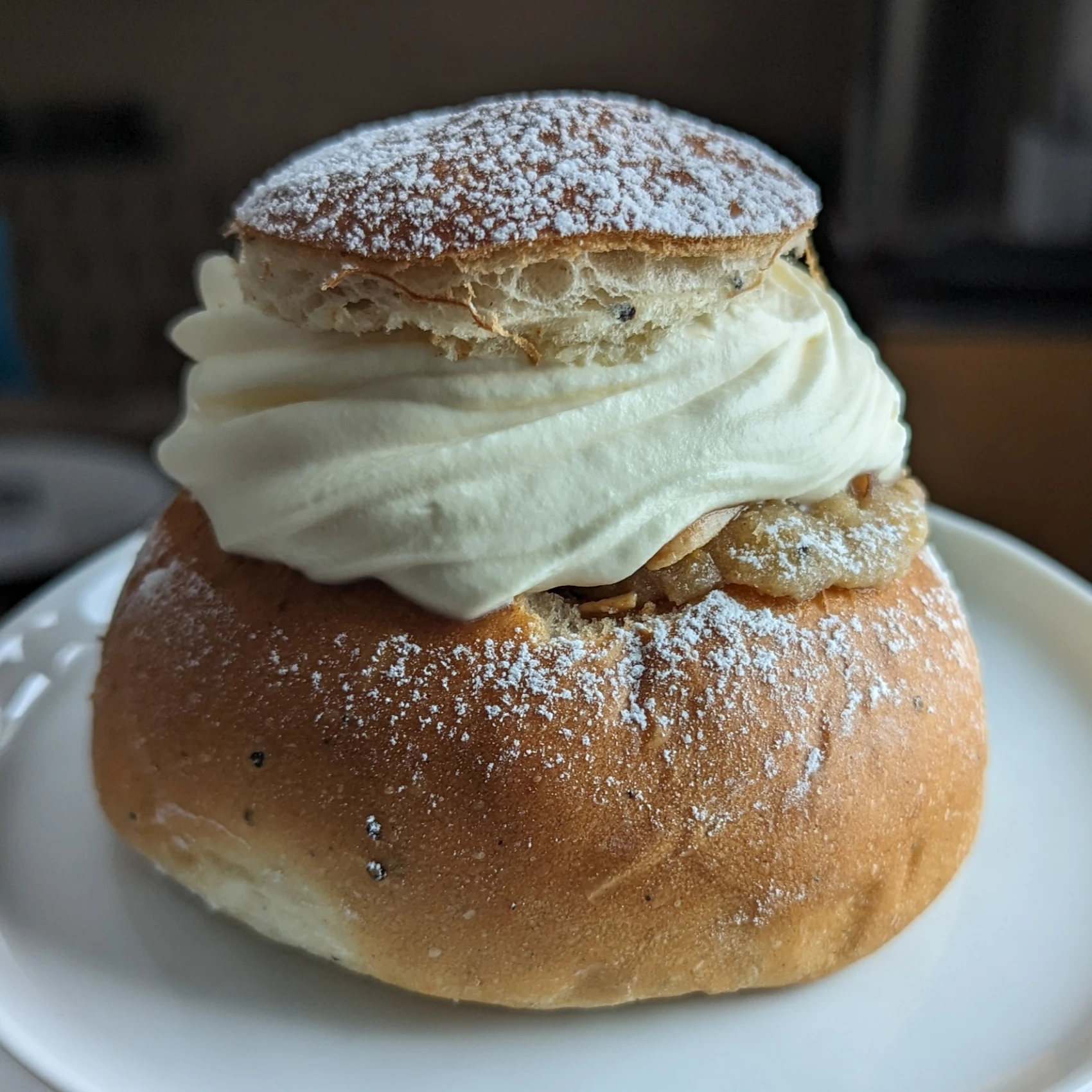 Medium large semla at about 9cm. A round lid and a couple of roughly chopped nuts peeking out from under the whipped cream. The cream has lost a little of its definition in the few hours since it was made.